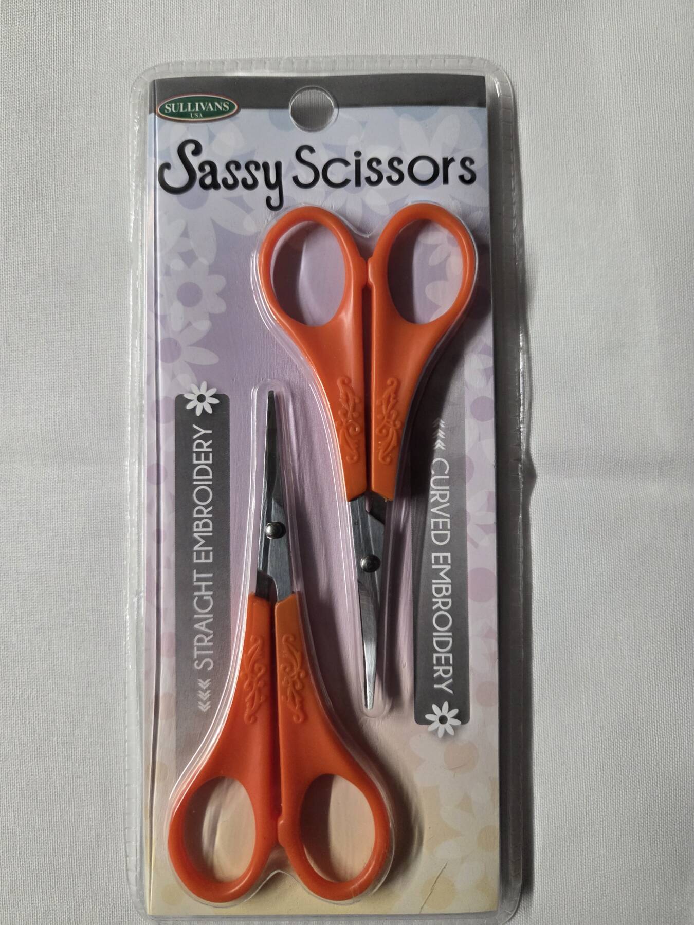 Nothing beats this winning combination of Sassy Embroidery Scissors. Both straight and curved embroidery scissors are a basic necessity for sewing and needlework enthusiasts. This package features two lightweight scissors with matching handles. One pair has a straight point, and another has a curved blade for intricate cutting and trimming. You will achieve a clean cut every time due to the high-quality, stainless-steel blades. Shop our additional Embroidery Scissors here.Â